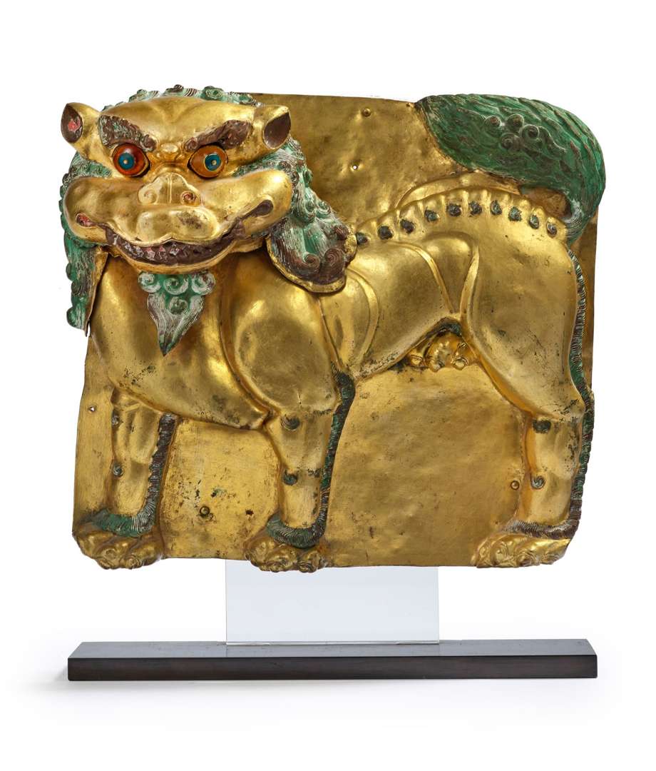 Grande plaque à décor d'un lion des neiges en alliage de cuivre repoussé et doré avec des rehauts de vert et de rouge, représenté debout, la tête tournée vers la gauche avec la gueule entrouverte, les yeux globuleux incrustés, la crinière bouclée, l'air menaçant. Socle. Dim. 33 x 35 cm (Quelques déformations et des usures) PROVENANCE Collection particulière, France NOTE Cette oeuvre est probablement un fragment de trône. Les trônes sont souvent flanqués d'animaux superposés - éléphant, lion et léogriffe - qui symbolisent les différentes régions de l'espace.