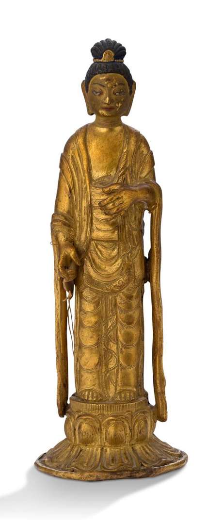 Statuette de bodhisattva en alliage de cuivre doré, représenté debout sur un socle lotiforme, vêtu de la robe monastique gravée de rinceaux sur fond poinçonné, le visage laqué avec le front paré de l'urna, les cheveux réunis en chignon au-dessus de la tête. Scellée. H. 21,5 cm (Attributs manquants et usures)
