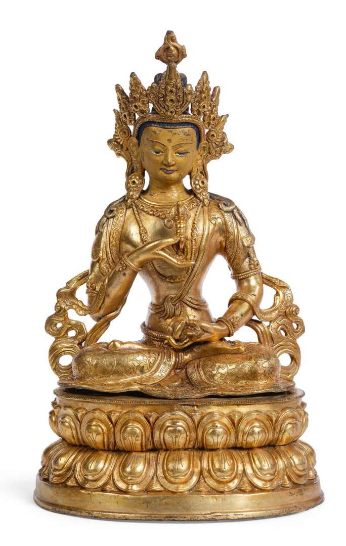 Grande statuette de Vajrasattva en alliage de cuivre doré, représenté assis en vajrasana sur une base lotiforme, tenant dans les mains les vajra et gantha, vêtu d'un fin dhoti, le visage laqué à l'expression sereine, le front paré de l'urna et sommé d'une tiare à cinq pics, les cheveux réunis dans un haut chignon, le corps paré de bijoux, une inscription au dos. Scellée. H. 40 cm (Choc en bas du dos)