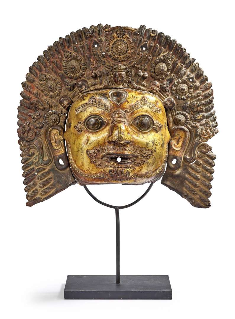 exceptionnel masque de bhairava, forme farouche de shiva, constitué d'un assemblage de plaques en alliage de cuivre martelé, repoussé, doré et rehaussé de polychromie, représenté sous un aspect courroucé, les yeux et le troisième oeil de la clairvoyance exorbités, les lobes d'oreilles percés, la bouche entrouverte hérissée de crocs et encadrée d'une moustache flammée de la même manière que les sourcils, le visage encadré de nattes de cheveux hérissées portant le croissant de lune s'élevant derrière une tiare à cinq fleurons ouvragés, dont l'un tripartite au centre, agrémentée de quatre têtes de citipatis liées par quatre serpents et d'une figure de shiva au centre. socle. dim. 47 x 53 cm (manques et usures) provenance - vente, the kemper collection of himalayan art, christie's, amsterdam, 11 octobre 1994, lot 67 - collection particulière, france (acquis au cours de la vente précédente) oeuvres en rapport - masque de bhairava, paris, musée national des arts asiatiques-guimet (inv. ma 5941) - masque de bhairava, londres, victoasie, sotheby's, paris, 16 juin 2022, lot 63 note l'art du 'NÉPAL' occupe une place de tout premier plan dans le monde himalayen. s'il prend sa source en inde, il conquiert rapidement son autonomie par le raffinement original de ses moyens d'expression et parvient à étendre sa réputation bien au-delà du territoire exigu où il voit le jour, jusqu'à susciter l'intérêt de la cour impériale de chine. au cours des festivités annuelles du pachali bhairabjatra et de l'indrajatra, qui se tiennent à katmandou à la fin du mois de septembre, des masques du dieu hindou bhairava sont placés devant les temples et les habitations. de ces têtes de divinités, qui ne sont jamais portées par des officiants ou des danseurs, s'écoulent par des chalumeaux des flots de bière domestique et d'alcool de riz consommés par les dévots. les masques sculptés sont emblématiques de l'art népalais. notre masque de bhairava, en alliage de cuivre doré, combine des techniques aussi variées que la sculpture, le martelage, le repoussé et la poly