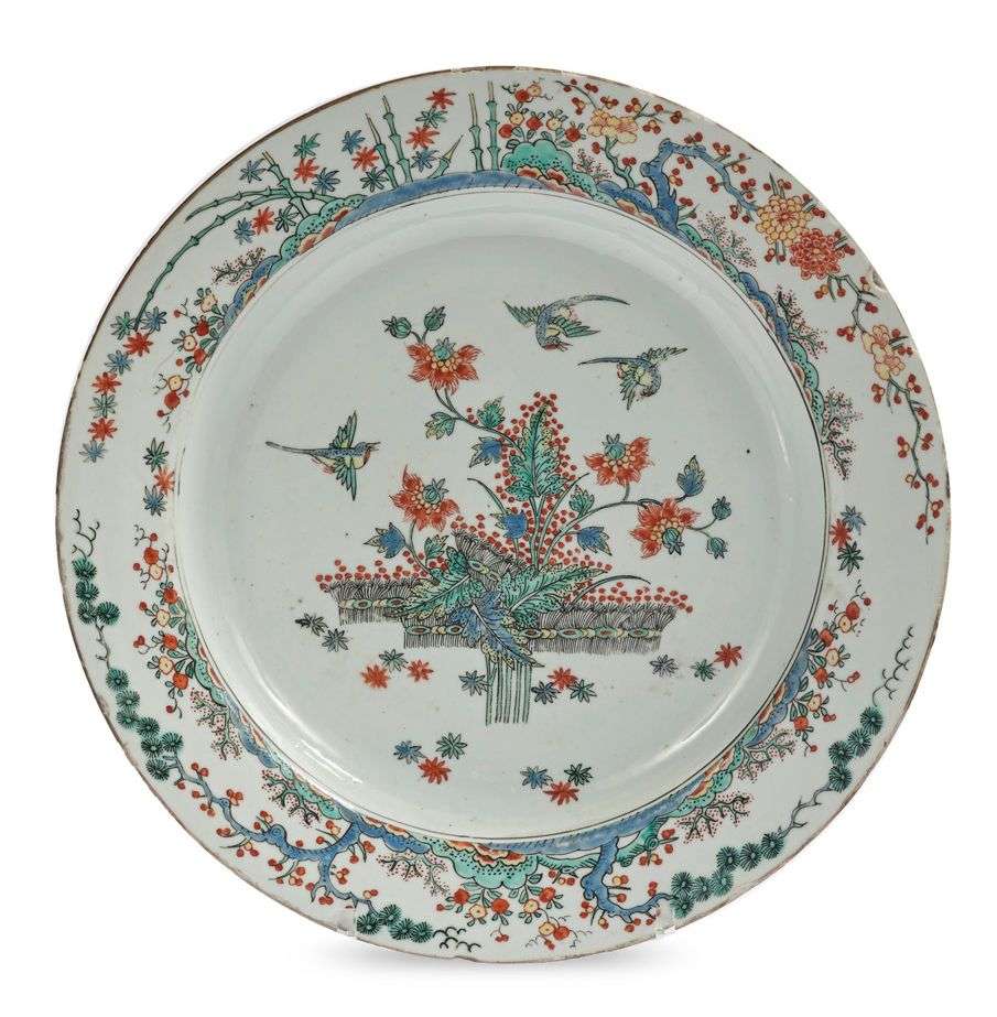 Assiette ronde en porcelaine, surdécorée aux Pays-Bas aux émaux polychromes de style Kakiemon d'oiseaux survolant une haie fleurie, pins de longévité et bambous. Marque sur la base. Diam. 28,4 cm (Égrenures, déplacages d'émail et usures)