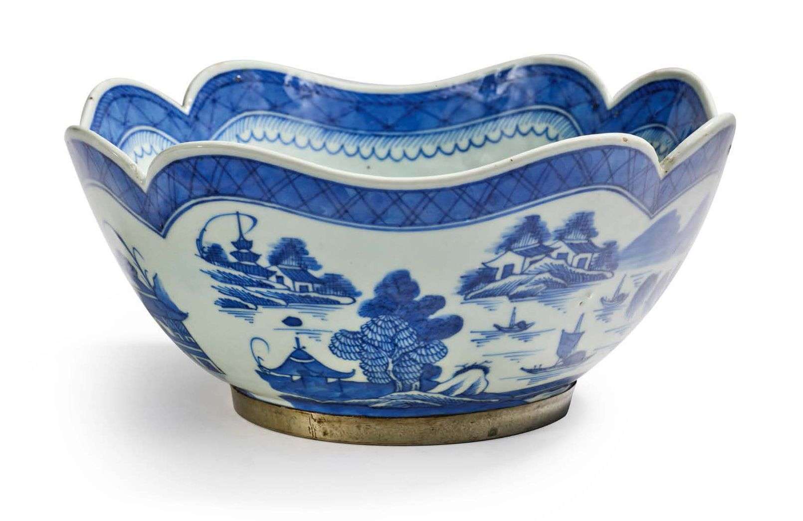 Légumier à bord en accolades en porcelaine bleu-blanc, à décor de paysages de montagnes et d'eau construits de pavillons et animés d'embarcations, le talon cerclé de métal. H. 11,5 cm - L. 25,5 cm (État du talon non garanti sous la monture)