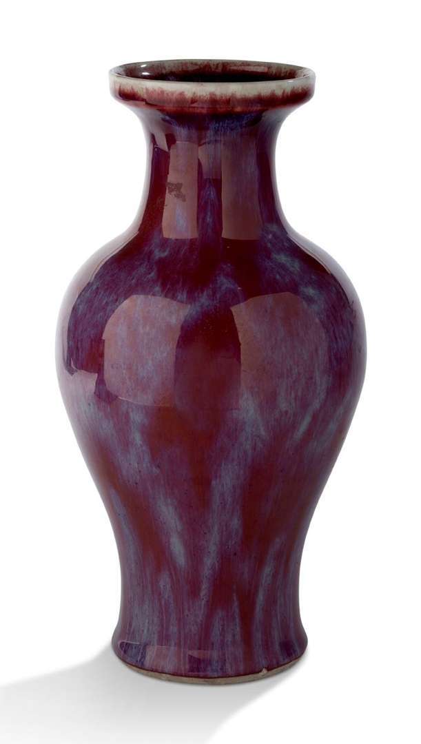 Vase guanyin en porcelaine et couverte flammée sang-de-boeuf infusée de lavande sur fond céladonné. H. 35,5 cm (Petite fêlure au bord)