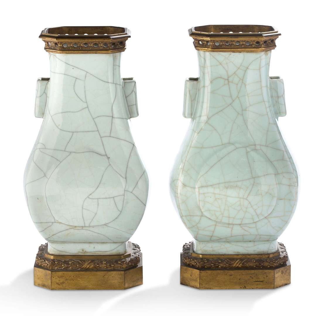 Paire de grands vases fanghu en porcelaine et couverte céladon pâle craquelée de type guan présentant des variantes entre les deux vases, le col flanqué de prises tubulaires, à décor en léger relief sur chacune des faces d'une pêche de longévité stylisée. marque sigillée daoguang sur l'une des bases. la base de l'autre vase rodée et dépouillée de sa marque. monture européenne en bronze doré de style louis xvi à décor d'un tore de laurier et de fleurons. h. totale 37,2 cm (restes du montage en lampe avec un cône métallique collé à l'intérieur de chacun des vases, bords probablement rodés, état sous la monture non garanti) provenance collection particulière, france (par descendance))