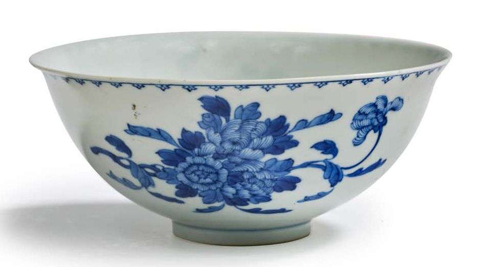 Bol en porcelaine bleu-blanc à décor floral, le bord souligné d'une frise de fleurons. Marque Guangxu sur la base. H. 7,3 cm - Diam. 17,2 cm (Égrenure poursuivie par une petite fêlure et petites bulles éclatées au bord)