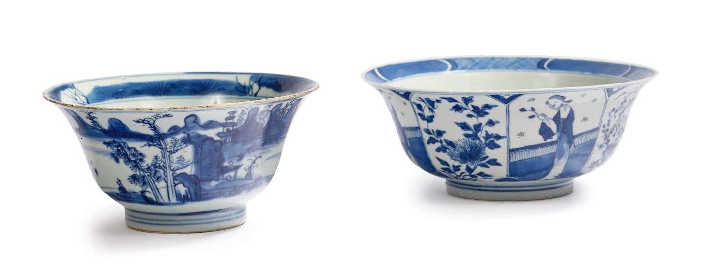 Lot de deux bols en porcelaine bleu-blanc, l'un à décor d'une alternance de panneaux accueillant un personnage féminin debout et des fleurs, l'autre à décor d'un paysage animé d'un pêcheur et d'embarcations. Marque angxi sur la base du premier et marque symbolique sur la base de l'autre. H. 8,4 cm - Diam. 20,3 cm H. 8,7 cm - Diam. 18 cm (Fêlures et égrenures à l'un | égrenures à l'autre)