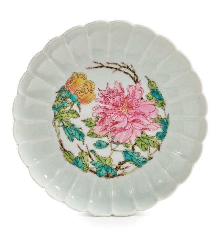 Petit plat rond à bord lobé en porcelaine et émaux polychromes de la famille rose, à décor de pivoines en médaillon. Marque apocryphe Yongzheng sur la base. Diam. 16,2 cm (Légères usures)
