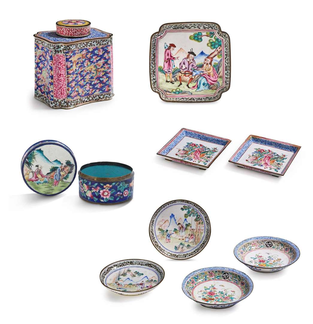 Lot de huit objets en alliage de cuivre et émaux peints polychromes de Canton dans le style de la famille rose, comprenant une boîte à thé et une boîte ronde, toutes deux couvertes, quatre petits plats ronds, deux raviers carrés et un autre polylobé, à décor de dragons dans les nuées, scènes animées de personnages, dont des Européens, et fleurs animées d'insectes. H. boîte à thé 10 cm Diam. max 15,8 cm (Restaurations anciennes, petites lacunes d'émail et fêlures) PROVENANCE Eymery & Cie, Paris (étiquette sur sept)