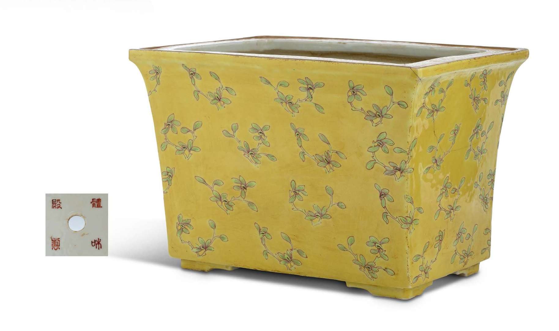 Jardinière rectangulaire à paroi évasée en porcelaine, émaux polychromes dans le style de la famille rose et rehauts de dorure, montée sur quatre petits pieds, à décor de brindilles sur fond jaune, le bord souligné de leiwens et d'un filet doré. Marque apocryphe à quatre caractères sur la base. Dim. 18,3 x 26,7 x 18,6 cm (Fêlures en étoile sur l'un des côtés et le bord et petites égrenures)