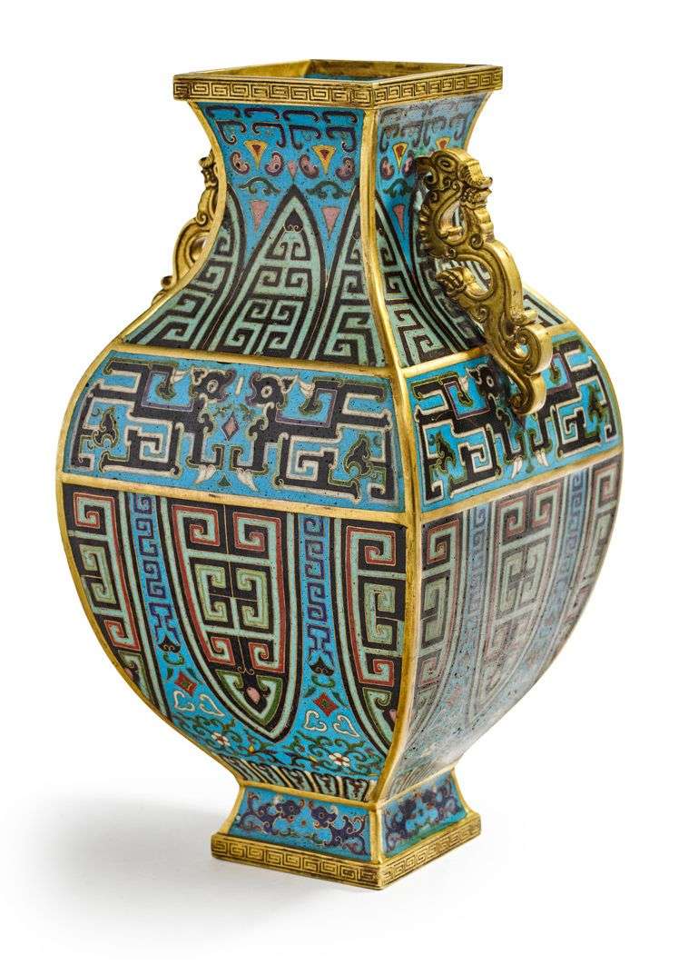 Vase fanghu en alliage de cuivre doré et émaux cloisonnés polychromes sur fond bleu, le col flanqué de prises en forrme de dragons stylisés, à décor d'ailes de cigales, dragons kui affrontés et enroulements archaïsants. Marque apocryphe Qianlong sur la base. H. 31 cm (Rayures et petites traces d'oxydation)