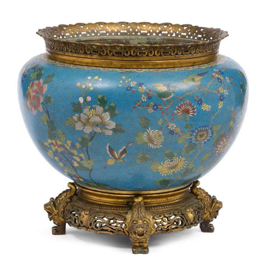 Grande jardinière bombée, en alliage de cuivre doré et émaux cloisonnés polychromes, à décor d'oiseaux et de papillons dans les fleurs et les bambous sur fond d'une myriade de svastikas, l'ouverture soulignée d'une frise ruyis. Monture chinoisante en bronze doré, dans le goût d'Édouard Lièvre, à décor de têtes de monstres, rinceaux et palmettes. H. totale 32 cm - Diam. 30 cm (État sous la monture non garanti et bord percé pour la galerie)