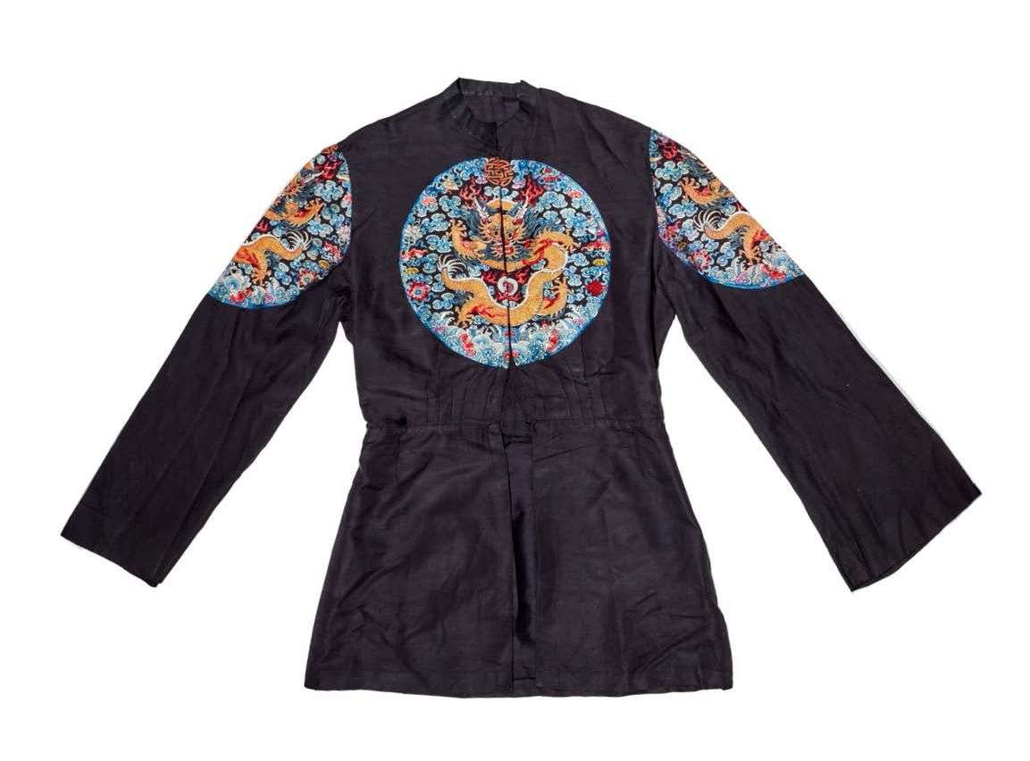 DYNASTIE QING, PÉRIODE GUANGXU (1875 - 1908) Chemise en satin de soie bleu nuit, à décor brodé aux fils polychromes et filés dorés de quatre dragons en médaillon dans les airs sur fond de caractères auspicieux et d'emblèmes bouddhiques au-dessus d'une bande de lishuis d'où s'élèvent des rochers primordiaux et des emblèmes bouddhiques. H. 81 cm (Petits accidents, taches, usures et possiblement transformée)