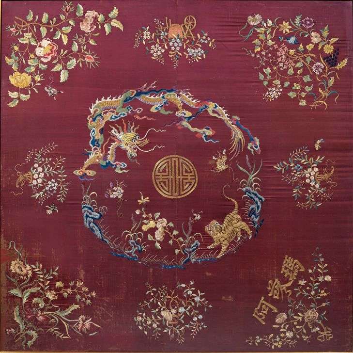 Grand panneau carré en soie lie-de-vin, à décor brodé en polychromie et filés dorés d'un caractère auspicieux, dragon et tigre en médaillon dans des encadrements floraux animés de papillons et d'oiseaux. Encadré sous verre. Dim. 139 x 139 cm (Déchirures, usures, salissures et fils tirés)