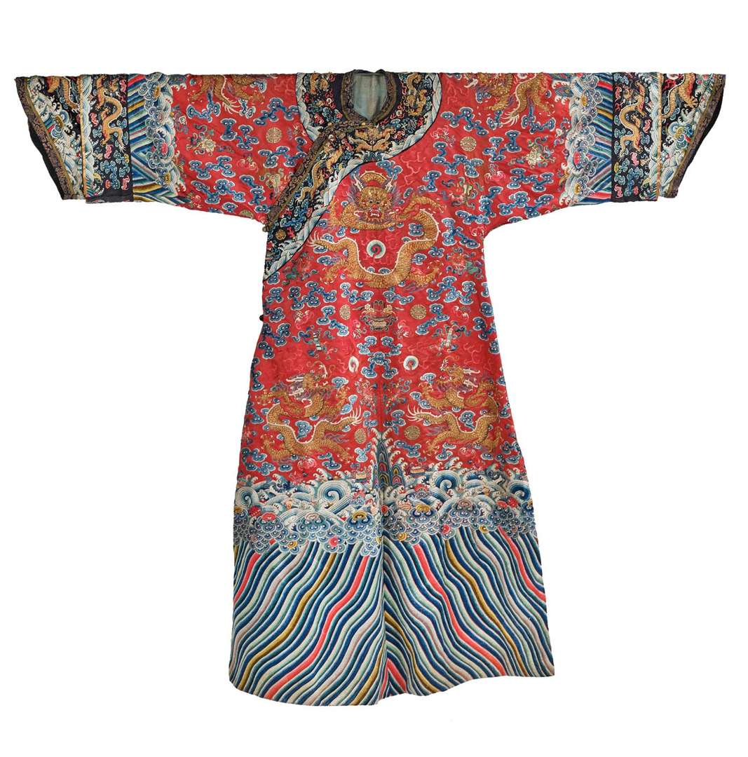 Belle robe en satin de soie rouge, à décor brodé aux fils polychromes et filés dorés de dragons dans les airs sur fond de caractères auspicieux et d'emblèmes bouddhiques au-dessus d'une large bande de lishuis d'où s'élèvent des rochers primordiaux et des emblèmes bouddhiques, la doublure en coton bleu. H. 142 cm - Larg. 160 cm (Petits accidents, taches, usures et possiblement transformée)