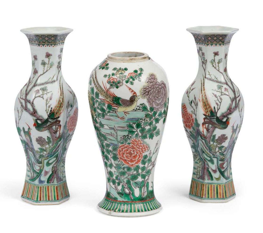 Lot de trois vases en porcelaine et émaux polychromes de la famille verte, comprenant une paire de vases balustre à pans et un vase balustre, à décor d'oiseaux dans les fleurs, les bases surmontées de panneaux de lotus. Marque apocryphe Kangxi sur les bases de la paire de vases et double-cercle sur la base de l'autre. H. 26 cm et 23 cm (Éclat au col de l'un des vases de la paire | col rodé, fêlure de cuisson et éclat sur la base du vase isolé)