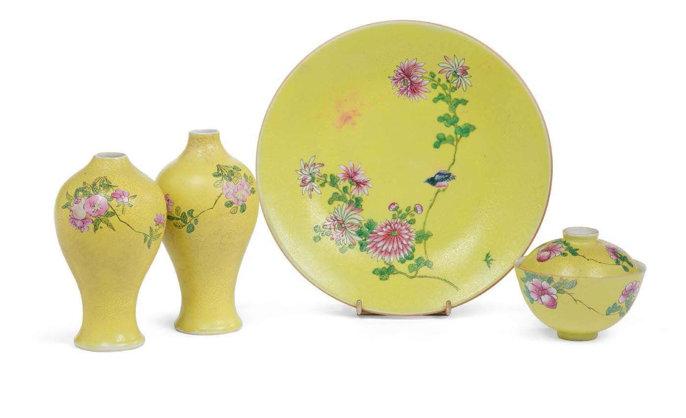 Suite de quatre objets en porcelaine et émaux polychromes de la famille rose comprenant deux vases balustres, un plat rond et un bol couvert, à décor de fleurs sur fond jaune travaillé a sgraffiato de rinceaux. Marque apocryphe Qianlong sur les bases. H. vases 16 et 17 cm - Diam. plat 25,5 cm H. bol 9 cm - Diam. 11 cm (Le col de l'un des vases restauré | fêlures, défaut d'émaillage et petite égrenure au plat)