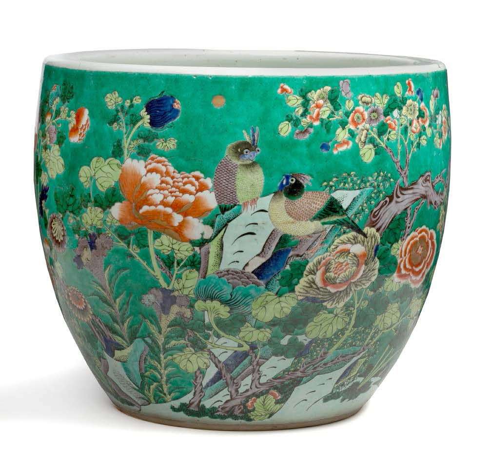 Belle et grande jardinière bombée en porcelaine, émaux polychromes de la famille verte et rehauts de dorure, l'ouverture formant rebord, à décor d'oiseaux dans les fleurs et les rochers sur fond vert, la base laissée en biscuit. H. 44 cm - Diam. 46,5 cm (Fêlures, fond percé, déplacages d'émail et rayures)