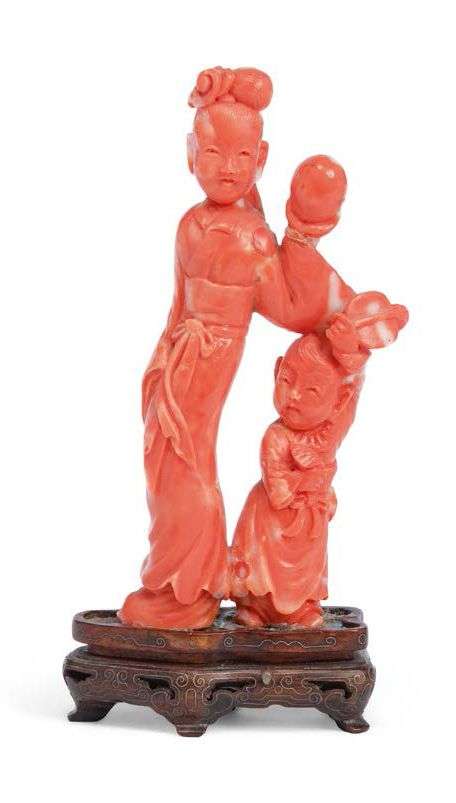 ~ Groupe en corail rouge orangé infusé de blanc, représentant une jeune femme en compagnie d'un enfant dansant, un écran dans la main gauche. Socle en bois incrusté de métal. H. 12,5 cm (La main gauche du personnage féminin recollée et de petites égrenures)