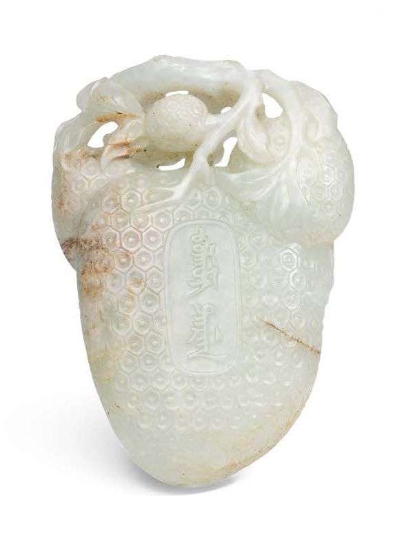 Grand pendentif en jade néphrite céladon pâle légèrement infusé de gris et traversé par une veine sombre, en forme de litchi sur sa branche portant de plus petits fruits, à décor sculpté en léger relief dans un médaillon ovale d'inscriptions d'abstinence en chinois sur une face et en mandchou sur l'autre. H. 8,5 cm