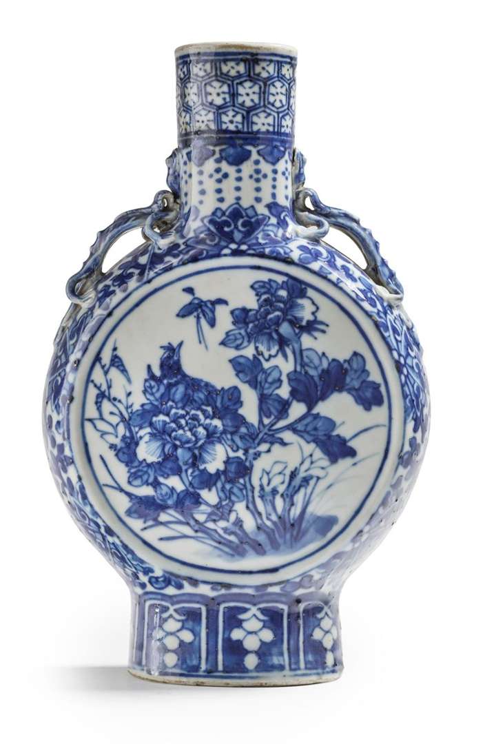 Vase gourde bianhu en porcelaine bleu-blanc, l'épaulement flanqué de qilongs, à décor d'oiseaux et de papillons dans les fleurs, la base surmontée de panneaux de lotus. H. 26,3 cm (Éclat ou possiblement rétraction d'émail au bord, bulles éclatées éparsées et fêlure de cuission visible à l'intérieur du col)