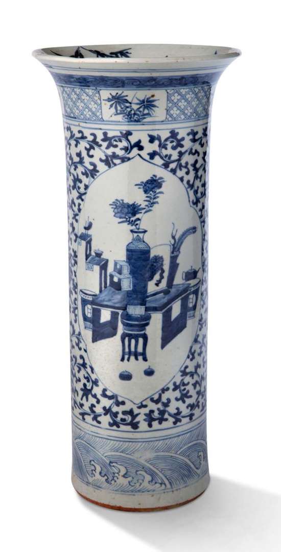 Grand vase rouleau en porcelaine bleu-blanc, à décor d'objets anciens et de vases emplis de fleurs dans des réserves polylobées sur fond de rinceaux, la base et le col soulignés de flots écumants et de réserves accueillant des bambous sur fond de damiers. H. 45 cm (Fêlures de cuisson, rétractions d'émail à l'intérieur et usures)