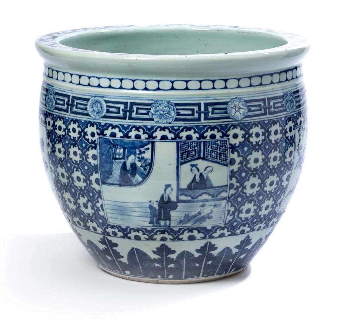 Jardinière bombée ou petit bassin à poissons en porcelaine bleu-blanc, à décor d’une alternance de réserves rectangulaires accueillant des scènes animées de personnages et d’un papillon ou d’un oiseau dans des fleurs sur fond de damier, la base et le col ornés de feuilles dressées, frises de perles et géométrique, la base laissée en biscuit.