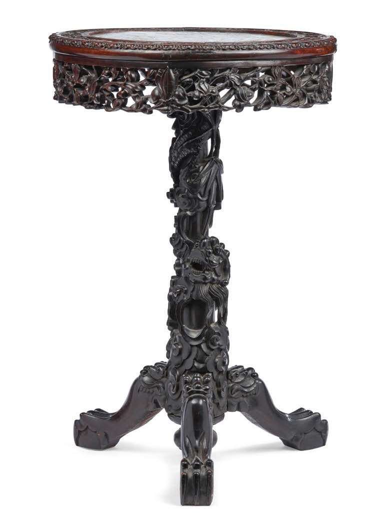 Guéridon en bois naturel, monté sur trois pieds griffes, le fût central flanqué d'un dragon dans les nuées, la ceinture sculptée et ajourée de branches de magnolia, le plateau rond encastré d'une plaque en porcelaine de Canton et émaux polychromes de la famille verte, à décor d'une scène animée de personnages près de pavillons avec une calligraphie dans un entourage de fleurs. H. totale 82 cm - Diam. 53 cm Diam. plaque 38,5 cm (Fissures, petits manques et usures)