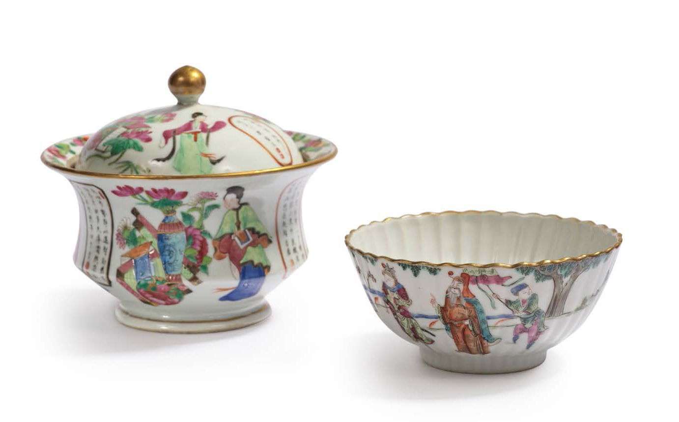 Lot de deux bols en porcelaine, émaux polychromes de la famille rose et rehauts de dorure, le bol couvert à décor d'une alternance de personnages près de vases emplis de fleurs et de calligraphies, celui à panse godronnée à décor de personnages dans un paysage. Marque apocryphe Qianlong sur la base du deuxième. H. 12,5 cm - Diam. 14,2 cm H. 5,6 cm - Diam. 12,3 cm (Couvercle avec fêlures et prise du recollée et petites égrenures aux bols)