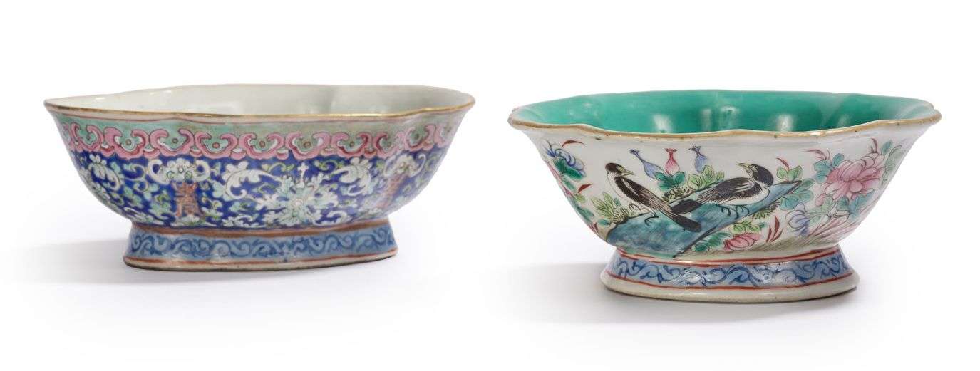 Lot de deux coupes sur pied polylobées en porcelaine, émaux polychromes de la famille rose et rehauts de dorure, à décor de caractères auspicieux dans les rinceaux et les lotus pour l'une et d'un couple de pies dans les pivoines pour l'autre. Marque sigillée apocryphe sur chacune des bases. H. 7,5 cm - L. 8,8 cm H. 7,7 cm - L. 7,9 cm (Usures)