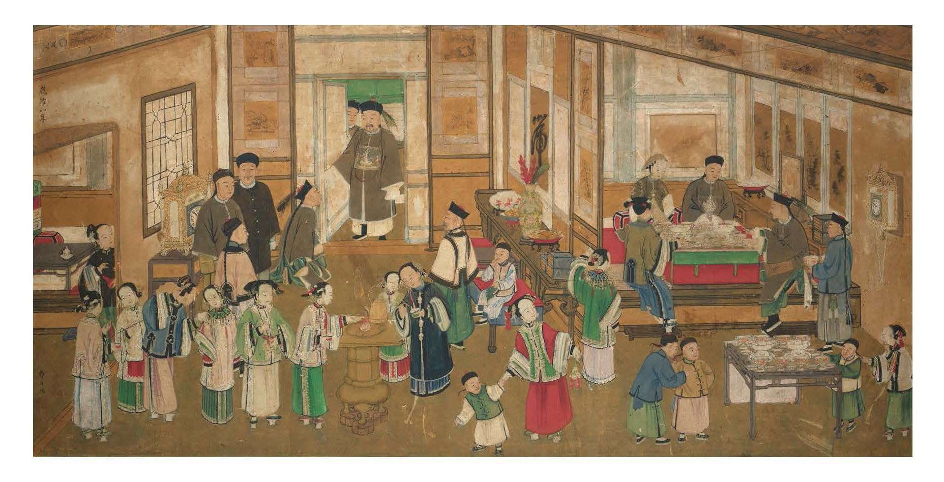 Grande peinture horizontale à l'encre et polychromie sur papier, à décor d'une scène animée de nombreux personnages dans un intérieur richement meublé et décoré de peintures, objets de collection et pendule à l'européenne. Signée Fei Danxu (1802 - 1850) en haut à gauche. Dans un encadrement.Dim. 63,5 x 128,5 cm(Collée sur un un carton, accidents, usures et taches)