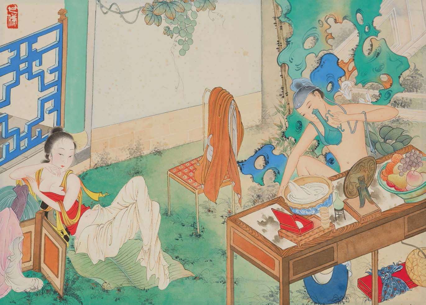 Peinture horizontale à l'encre, polychromie et rehauts de dorure sur papier, représentant un couple d'amoureux dans un jardin. Cachet en haut à gauche.Dim. 24,3 x 33,5 cm(Rousseurs, montage postérieur)