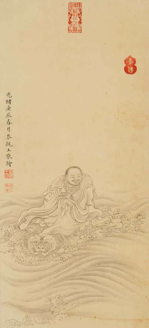 Peinture verticale à l'encre et lavis d'encre sur soie, représentant l'un des dix-huit arhats, Pindola Bharadvaja, assis sur un lion dont la tête émerge de flots écumants. Calligraphie et cachets apocryphes en haut. Dim. 52 x 23,5 cm (Rousseurs et montage postérieur)