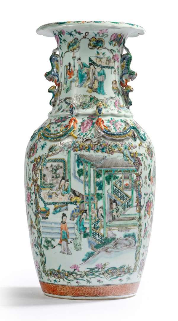 Vase guanyin en porcelaine de Canton, émaux polychromes de la famille rose et rehauts de dorure, l'épaulement et le col agrémentés de qilongs et de lions bouddhiques, l'ouverture festonnée, à décor de scène animées de personnages près de pavillons. H. 45 cm