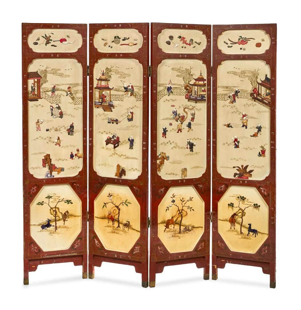 Paravent à quatre panneaux en bois laqué, à décor incrusté en pierres dures diverses et défense de morse de jeux d'enfants dans un jardin et de fruits et d'animaux dans les registres inférieur et supérieur, l'autre face ornée d'insectes et de végétaux sur fond cognac. Dim. un panneau 183 × 45,5 cm Dim. totale 183 x 186 cm (Accidents et usures)