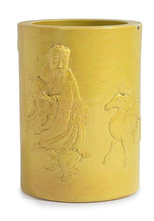 Pot à pinceaux bitong en porcelaine dans le style de Wang Ring Rong, à décor finement moulé sous couverte jaune de Shoulao debout, une grande pêche de longévité dans les mains, en compagnie d'un daim, deux chauves-souris volant dans le ciel, le bord et le talon ornés d'un fin semis de points incisés. H. 12,3 cm - Diam. 9,2 cm (Deux éclats au bord et d'infimes égrenures au décor)