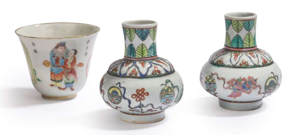 ET PÉRIODE RÉPUBLIQUE (1912 - 1949) Lot de trois objets en porcelaine et émaux polychromes de la famille rose comprenant une coupe à alcool à paroi évasée et une paire de petits vases bouteilles, à décor de héros et d'héroïnes des dynasties passées pour l'un et d'emblèmes bouddhiques pour l'autre, le col des vases orné de feuilles dressées. H. coupe 7,8 cm - Diam. 9,5 cm H. vases 10 cm (Deux petites égrenures et des usures à la coupe)