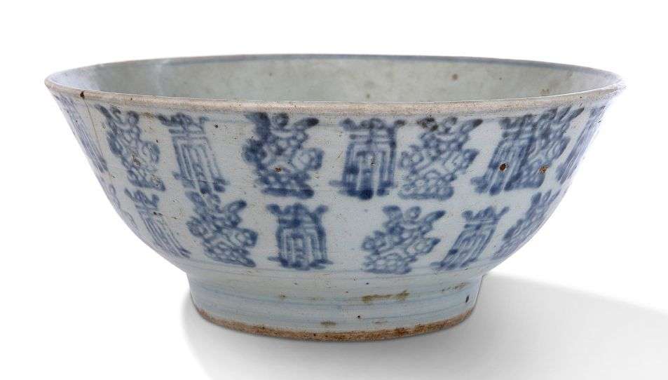 Lot de quatre objets en porcelaine bleu-blanc, comprenant une paire de coupes circulaires à décor d'un caractère auspicieux et de phénix, le bord de l'une cerclé de métal, marque aux poissons sous chacune | un grand bol à décor de caractères auspicieux et un pied de lampe à pétrole composite à décor de dragons et de frises de fleurs. Diam. coupes 16,2 et 15,7 cm H. bol 10,4 cm - Diam. 25 cm H. lampe à huile 27 cm (Petites fêlures et usures aux coupes | fêlure et usures au bol et fêlures et petites égrenures au pied de lampe)