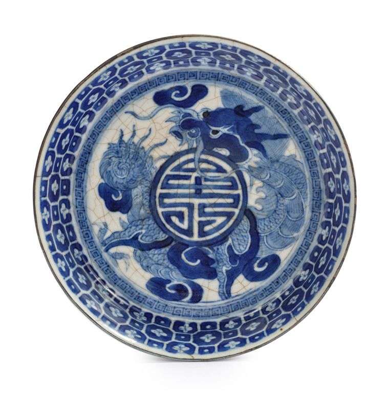 Petit plat à paroi droite en porcelaine, à décor au bleu de cobalt sur fond crème craquelé d'un dragon derrière un caractère auspicieux, l'aile ornée d'un damier fleuri et le bord cerclé de métal. Caractère auspicieux sur la base. Diam. 12 cm (Fêlures)