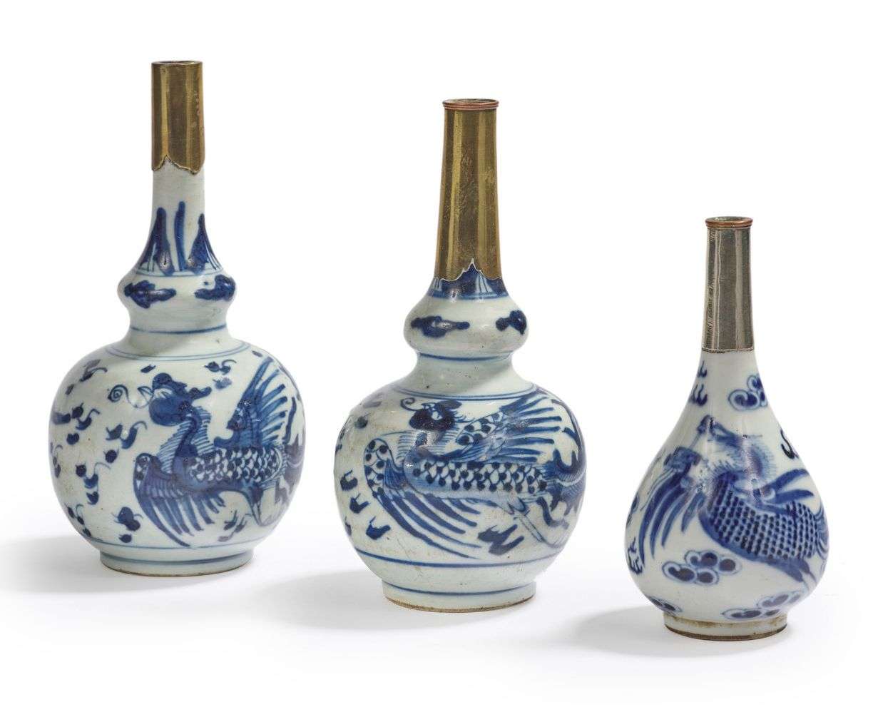 Lot de trois vases bouteilles en porcelaine bleu-blanc, à décor de phénix dans les éclairs et les nuées, les cols dotés de montures en métal. Marque Noi Phu sur la base du plus petit. H. de 15 à 20 cm (Rayures et usures)