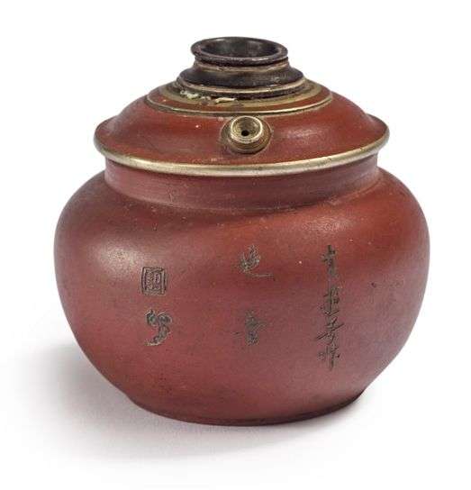 Pipe à eau bombée en grès de Yixing, la paroi unie à décor incisé d'une calligraphie, le bord cerclé de métal. H. 7,6 cm