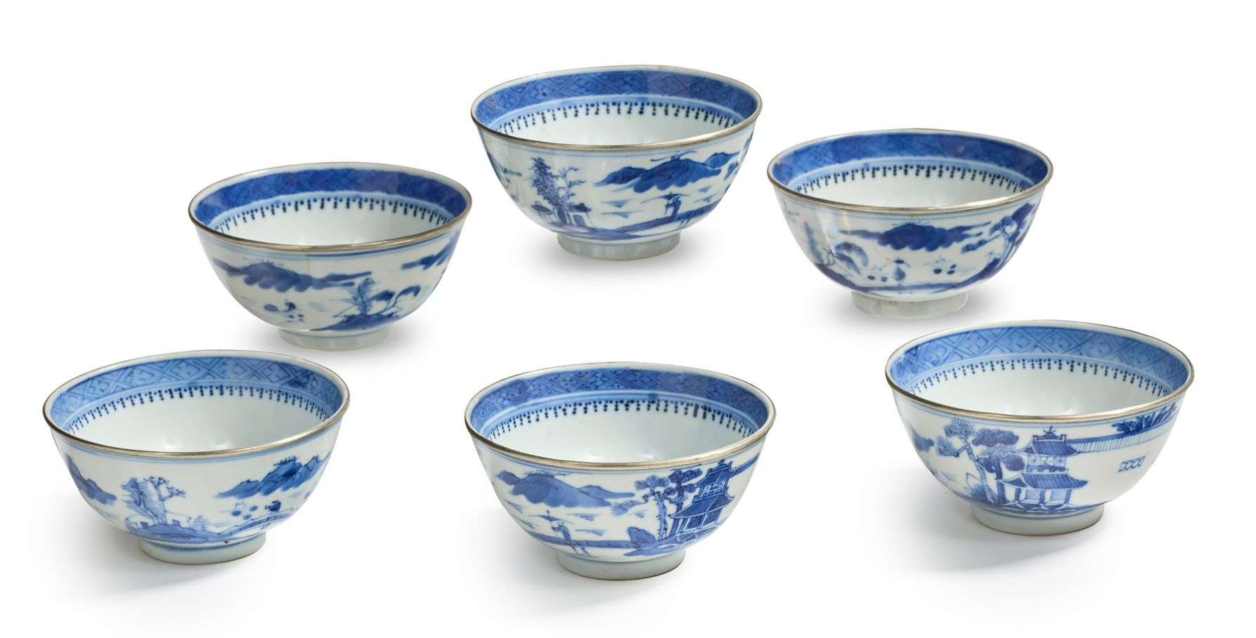 Suite de six bols en porcelaine bleu-blanc, à décor d'une forteresse et personnage sur un pont, les bords cerclés de métal. Marque apocryphe Kangxi sur les bases. H. de 5,4 à 5,6 cm - Diam. 11 cm (Fêlure et éclat à la base de l'un, un petit éclat poursuivi par une fêlure sur le bord de l'autre)