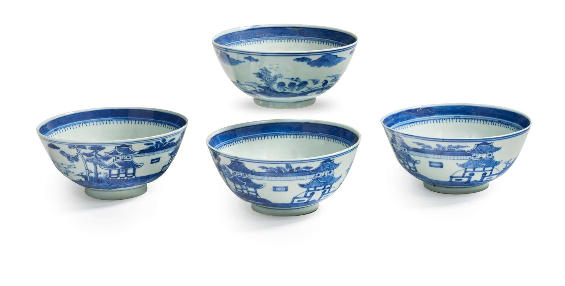 Suite de quatre bols en porcelaine bleu-blanc, à décor d'une forteresse et d'un personnage sur un pont. Marque apocryphe Kangxi sur chacune des bases. H. de 7 à 7,3 cm - Diam. 15,7 cm (Fêlures au bord de l'un et petites égrenures)