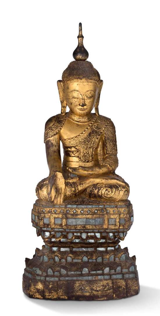 Grande statuette de Bouddha Shakyamuni en bois laqué et doré rehaussé de petits miroirs, représenté assis en vajrasana sur une base à degrés, la main droite tenant le fruit du myrobolan, la gauche posée à plat, les yeux mi-clos en méditation, les cheveux et l'ushnisha bouclés surmontés d'un bouton de lotus stylisé. H. 80 cm (Manques et accidents dont aux miroirs, usures, la trappe à l'arrière de la base ouverte)
