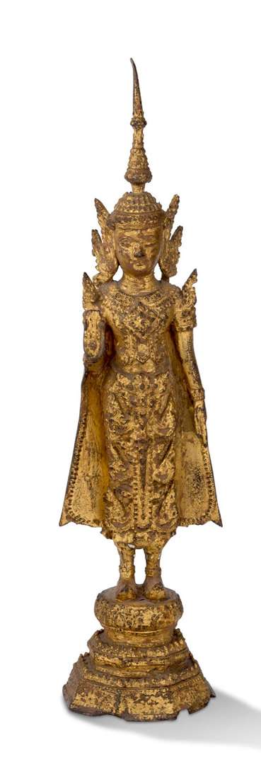 Statuette de Bouddha en bronze laqué et doré, représenté debout sur un socle à gradins, la main droite en abhayamudra, vêtu du samghati, la chevelure hérissée de petites boucles d'où s'élève une flamme stylisée. H. 39,5 cm (Petits manques en partie basse, usures et flamme tordue)