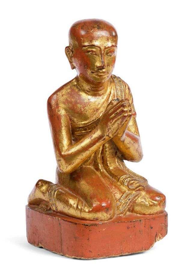 Statuette de Sariputta ou Moggallana, les premiers disciples de Bouddha, en bois laqué et doré rehaussé d'applications de verroterie, représenté agenouillé sur une base rectangulaire, le crâne rasé, les mains jointes en prière. H. 30,5 cm (La base érodée, quelques lacunes de laque et des usures)