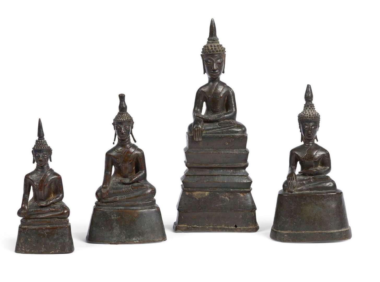 Réunion de quatre statuettes de Bouddha Maravijaya en bronze à patine sombre, représentés assis en dhyanasana sur un socle, la main droite en bhumisparshamudra, vêtu de la robe monastique leur découvrant l'épaule droite, les yeux mi-clos en amande, les lobes des oreilles parfois allongés, les cheveux coiffés en boucles surmontés de l'ushnisha et d'une petite flamme stylisée. H. de 15,2 à 25,5 cm (Perforations, une flamme écourtée, traces d'oxydation et usures)