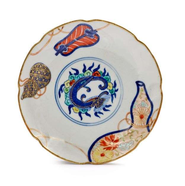 Petit plat en forme de fleur en porcelaine, bleu de cobalt sous couverte, émaux polychromes et rehauts de dorure, à décor Imari d'un dragon en médaillon, gourdes rubannées et écran sur la face et, sur le revers, de gourdes rubannées et de fleurs. Marque apocryphe Wanli sur la base. Diam. 15 cm (Éclat et égrenure) OEUVRE EN RAPPORT Notre oeuvre est à rapprocher d'un bol conservé au Victoria & Albert Museum de Londres (Inv. C.318 - 1819).