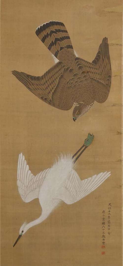 Grand kakemono à l'encre et polychromie sur soie, représentant un faucon, peint dans des dégradés de bruns, poursuivant une grue blanche.Signé et daté Tenppô 12 (1841).Dim. 127 x 57,5 cm(Doublée, taches, restaurations le long du bord droit et un embout manquant)