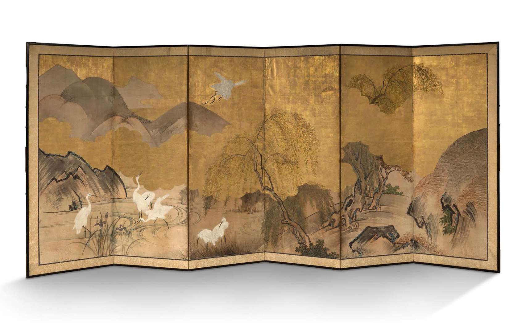 Grand paravent byobu à six feuilles à l'encre, polychromie et feuilles d'or sur papier, représentant un paysage lacustre bordé de saules aux troncs noueux sur fond de montagnes émergeant de nuages dorés, un groupe de six hérons blancs se baignant parmi les iris, un septième en vol. Dim. feuilles des extrémités 154 x 54,5 cm Dim. feuilles centrales 154 x 61,5 cm (Trous pour l'accrochage au dos, petites perforations, légères déchirures, marques d'humidité et usures)