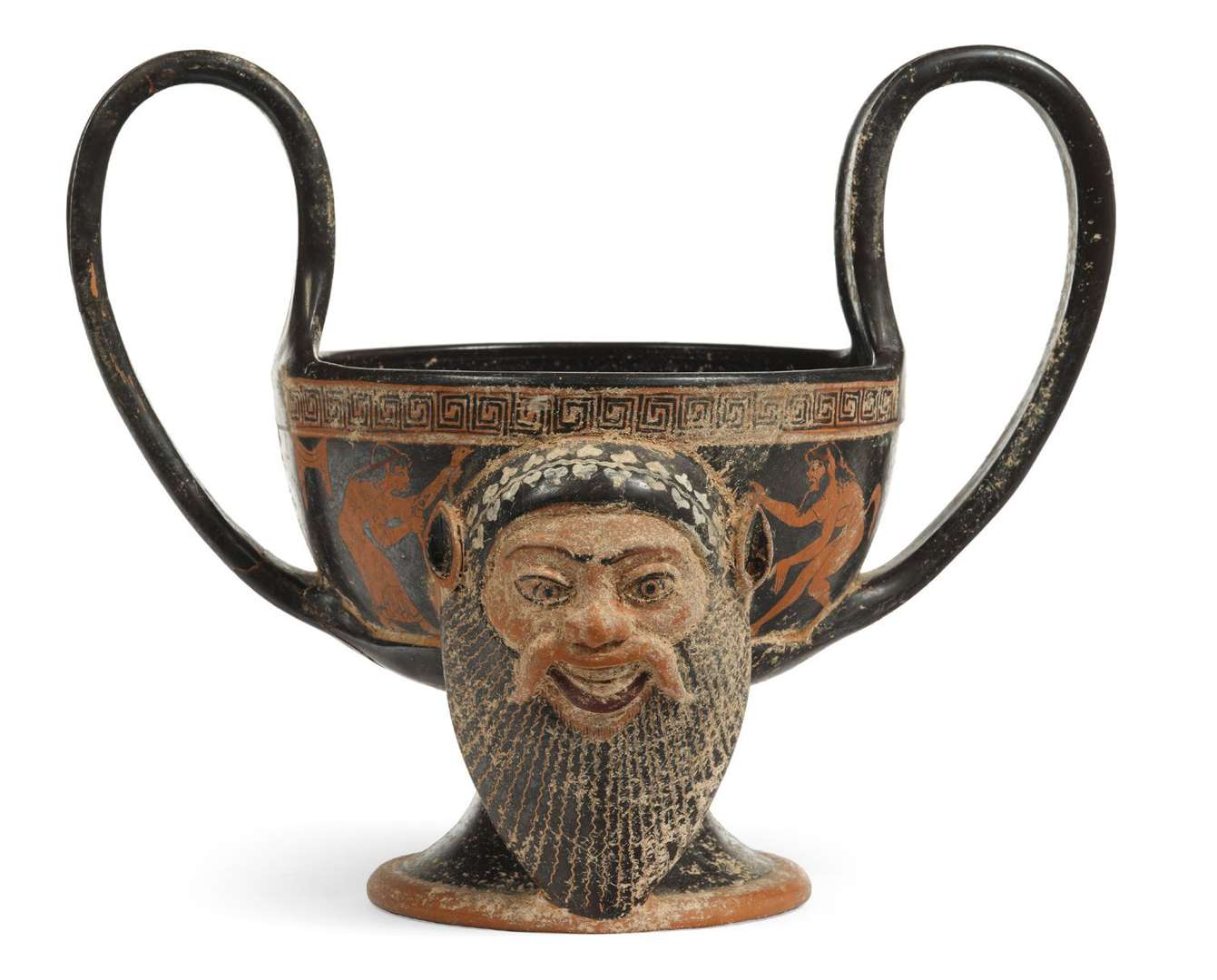 CANTHARE JANIFORME à têtes de satyres barbus en relief en terre vernissée noire à figures rouges d'une pêcheuse, d'un athlète et d'un satyre.